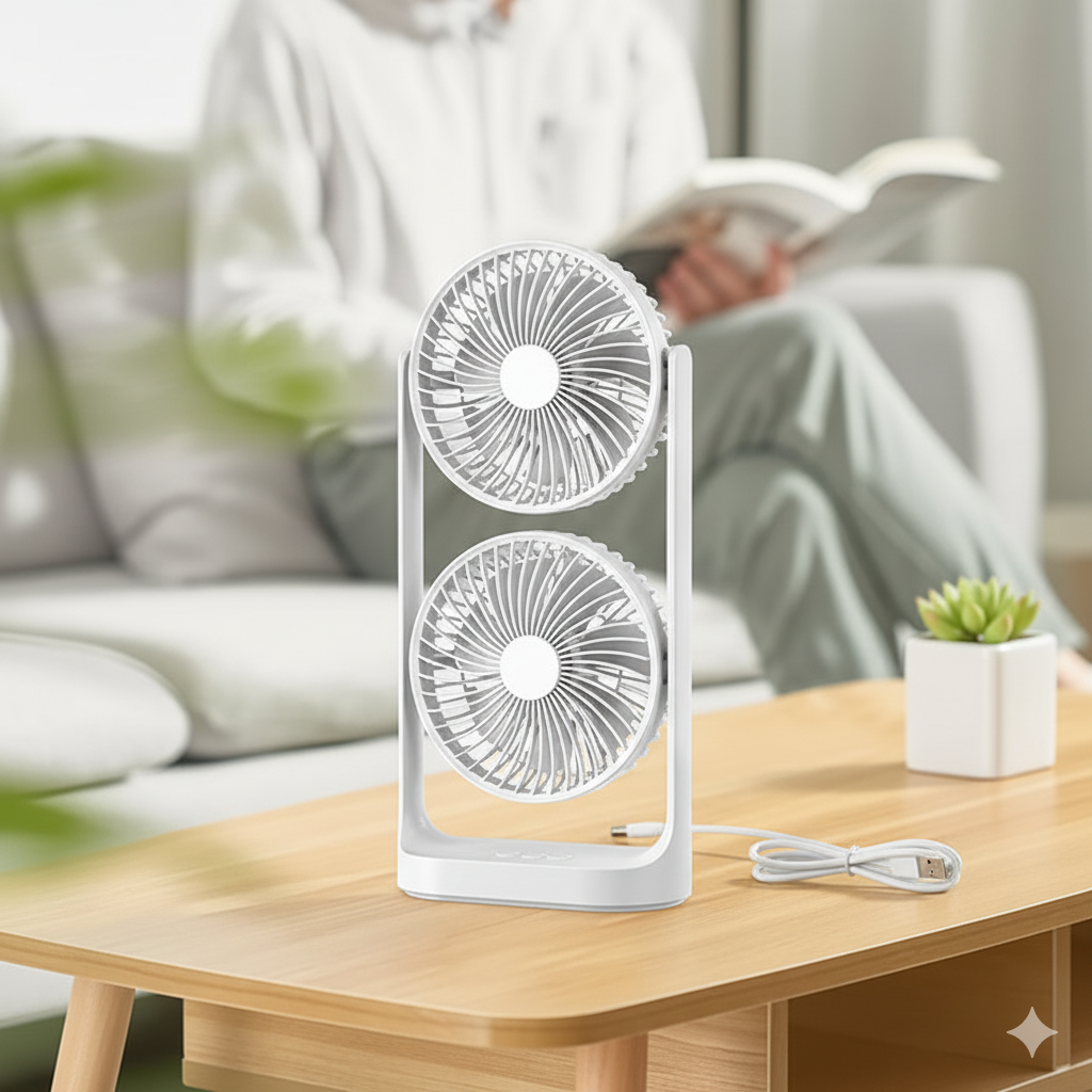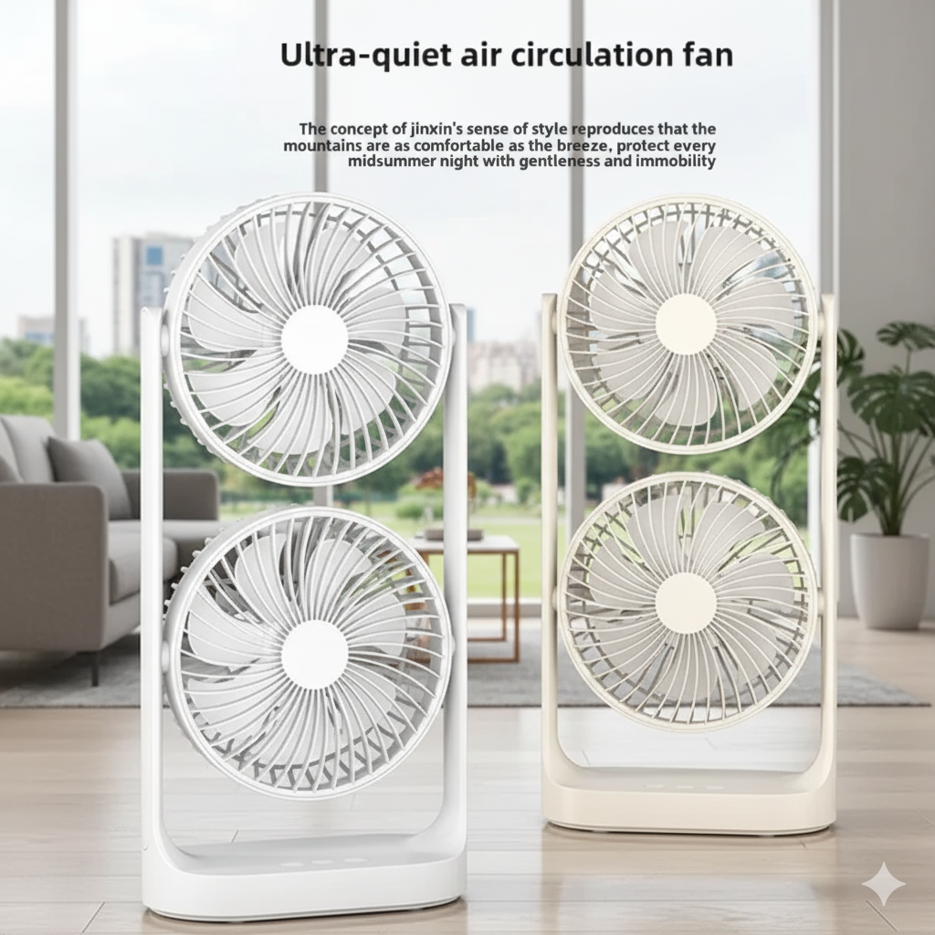 A portable double-layer cooling fan features two fans to provide strong airflow and wider cooling coverage, often with independent heads and adjustable tilt for targeted cooling. The double-layer blades are designed to improve cooling efficiency and reduce noise. Key features include portability, quiet operation, multiple speed settings, and a stable base. They are ideal for desks, offices, and indoor spaces, and some models may include rechargeable batteries for power-independent use.