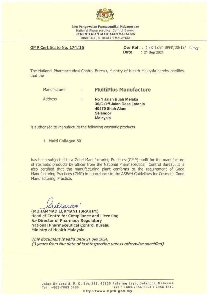 Multi-Collagen 5x মালয়েশিয়ার স্বাস্থ্য মন্ত্রণালয় দ্বারা অনুমোদিত এবং ১০০% হালাল certificate প্রাপ্ত Collagen supplement।